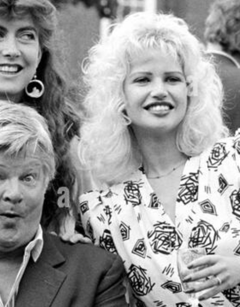 Standing, Left to Right: Jayne Melville, Mandy Perryment, Sue Upton, Benny Hill (seated), Debbie Linden, Victoria Shellard and an unknown. Kneeling, Left to Right: Louise English, Sharon Bond and Tina Bond (The Bond Sisters) and an unknown.